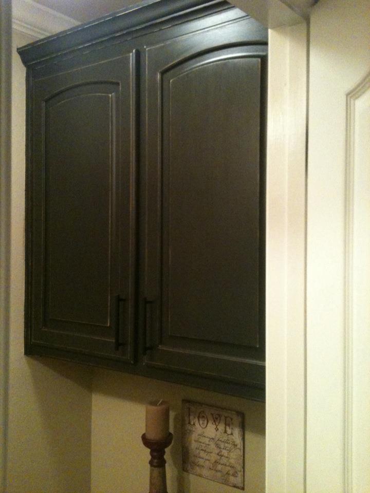 | Painted cabinets black and slightly distressed cabinets to match mirror hanging adjacent from it.... |