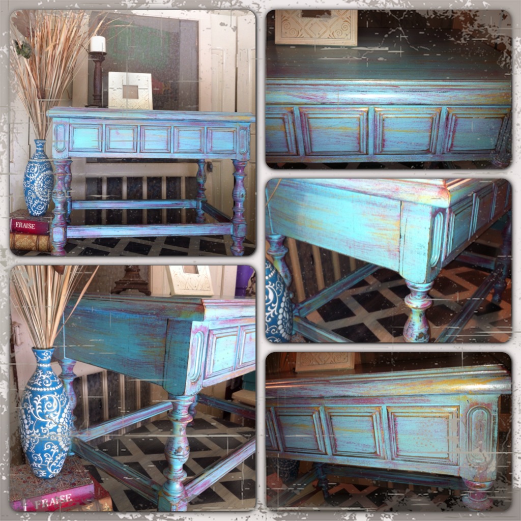 This is a beautiful piece.... Top hutch, top of desk, and drawer were painted aqua with hints of brown and gold- Back of desk and bottom were painted antique white... Love the color contrast!! For Sale $ 170 SOLD |
